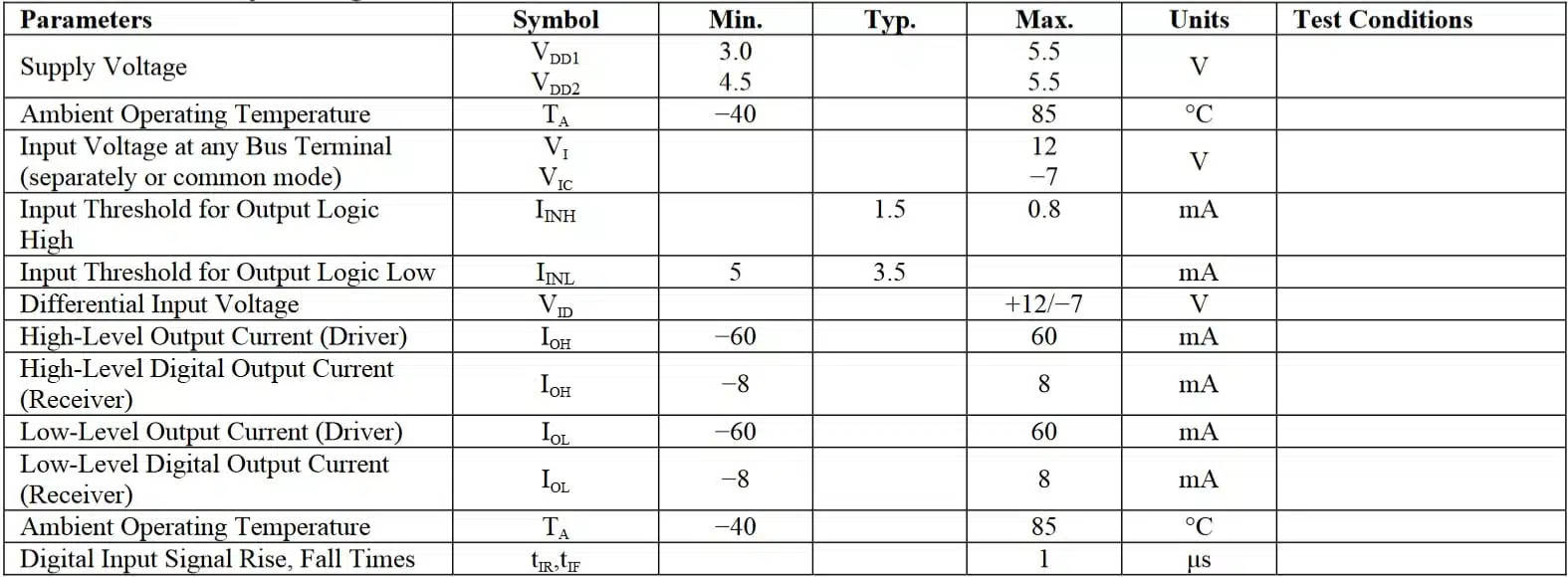 The below table gives the recommended operating conditions for the NVE IL3285 high speed passive input RS-485 differential bus transceiver series including the IL3285-3E: