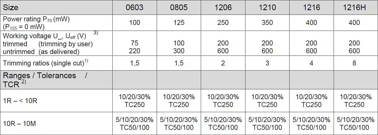 | SKU | Resistance Value | Temperature Coefficient | Tolerance |
